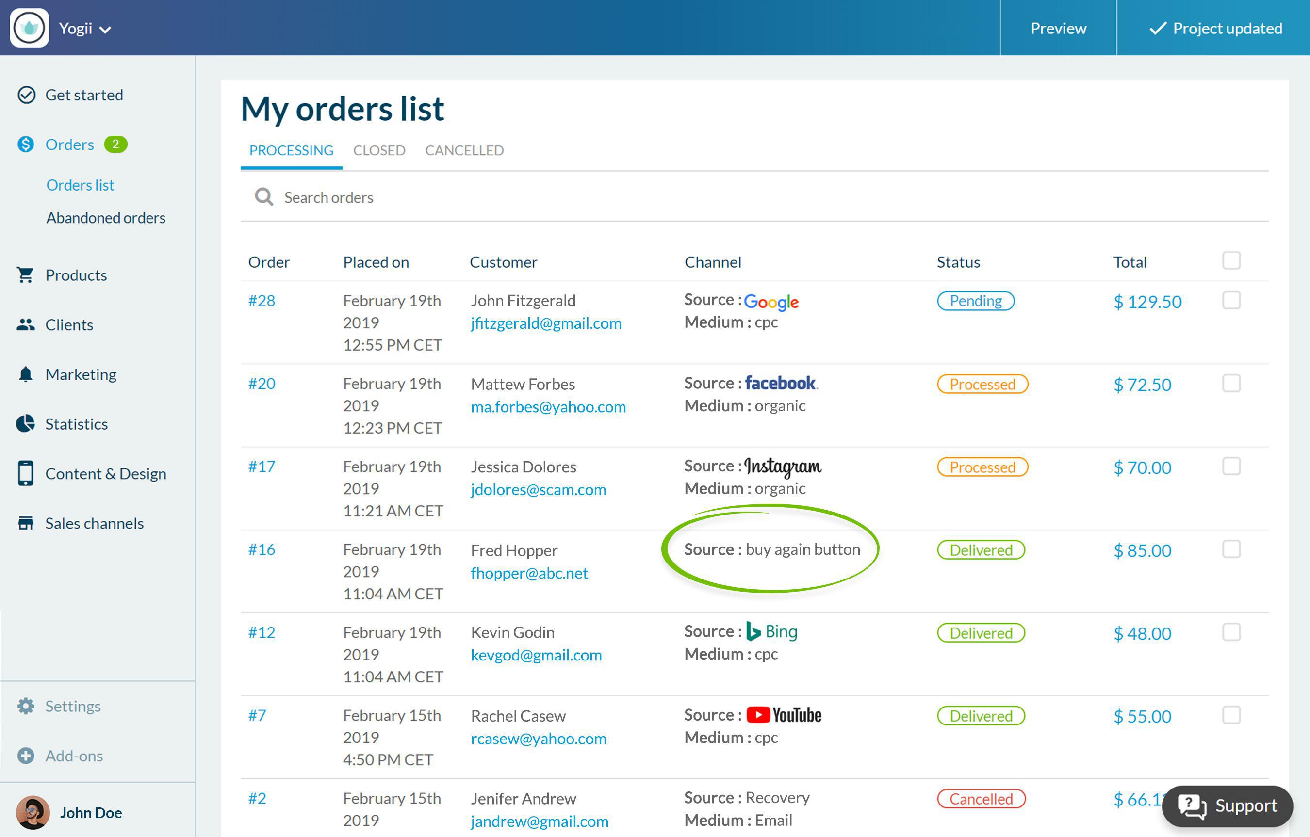 Aangezien de knop "Opnieuw kopen" wordt geïdentificeerd als een aankoopkanaal in de bestelgeschiedenis, kunt u terugkerende aankopen volgen.