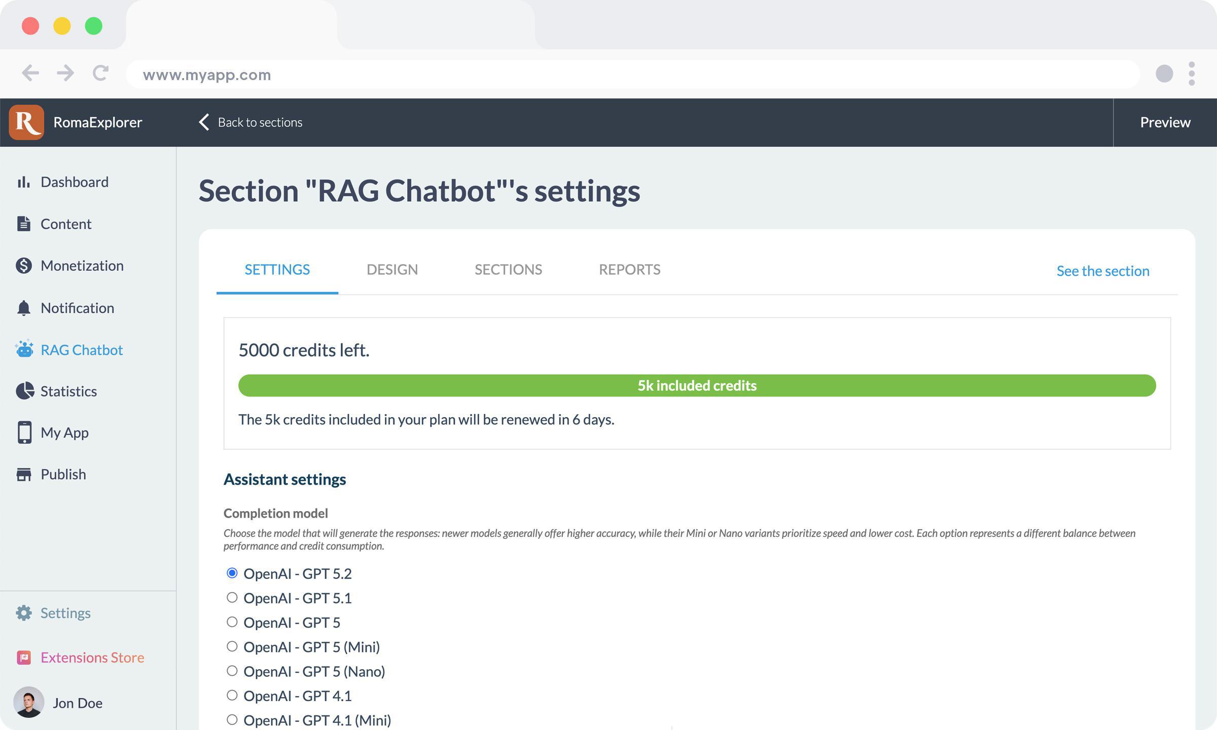 Navigeer naar uw RAG Chatbot instellingen in de GoodBarber backoffice om uw huidige tegoed te bekijken. Het monitoren van het gebruik tijdens uw eerste weken is essentieel om een basislijn vast te stellen voor uw specifieke inhoud en publiek.