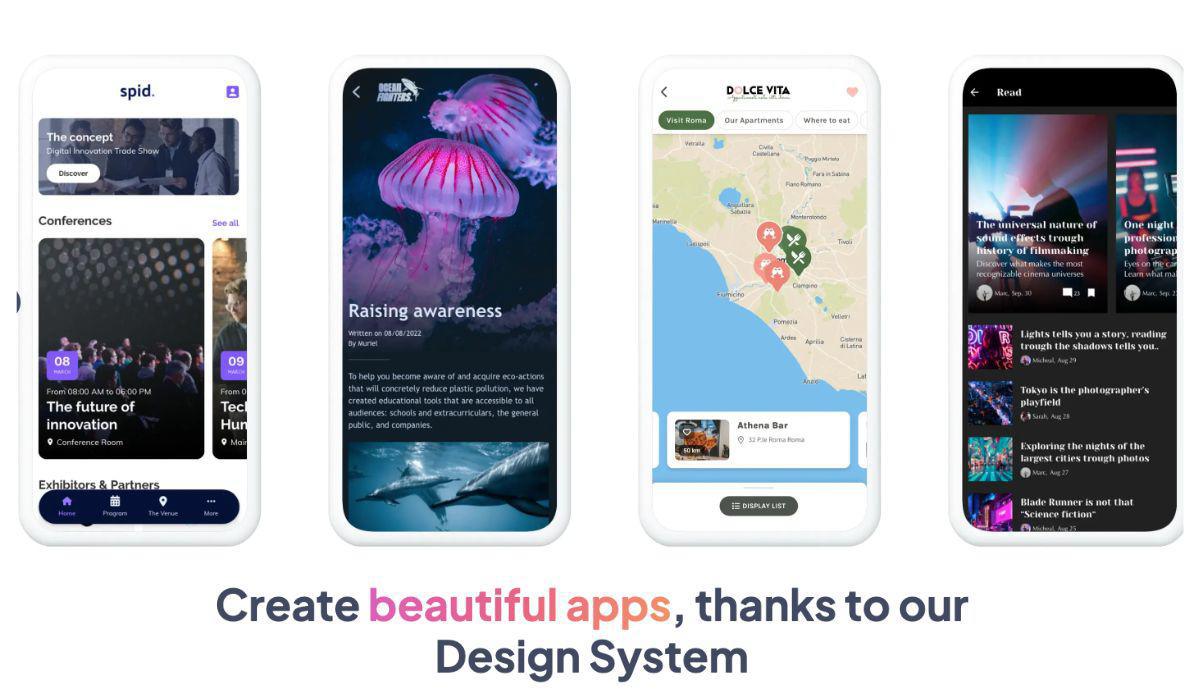 Ontwerp: GoodBarber stelt de gebruiker centraal in het ontwerpproces. Het is de eerste App Builder die een Design System heeft gemaakt, een set regels die standaard wordt toegepast op elke pagina die u in uw applicatie maakt. Dankzij het Design System kunt u de visuele consistentie tussen alle pagina's in uw applicatie behouden: goed beheer van de ruimte, een duidelijke hiërarchie en goed beheer van Lettertypen en Kleuren in uw applicatie. Met een grote bibliotheek van Sjablonen en thema's, die voortdurend worden bijgewerkt om aan de nieuwste ontwerptrends te voldoen, hoeft u zich geen zorgen te maken over het maken van een mooie app. Wij hebben alles wat u nodig hebt!