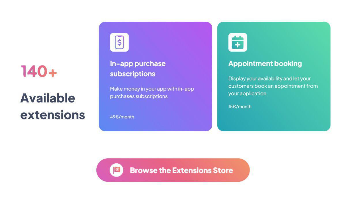 Kenmerken: Wanneer u GoodBarber gebruikt, hebt u toegang tot een steeds groter wordende bibliotheek met Add-ons. Er zijn meer dan 140 Add-ons beschikbaar (geïntegreerd of betaald). Er zijn meer dan 140 Add-ons in de uitbreidingswinkel. Of u nu bestaande Inhoud op platforms van derden hebt (WordPress, Airtable, SquareSpace, ...) of meer wilt doen in minder tijd, dankzij Zapier en Make, of extra functionaliteit wilt Toevoegen, er is een extensie voor in deAdd-ons Store .