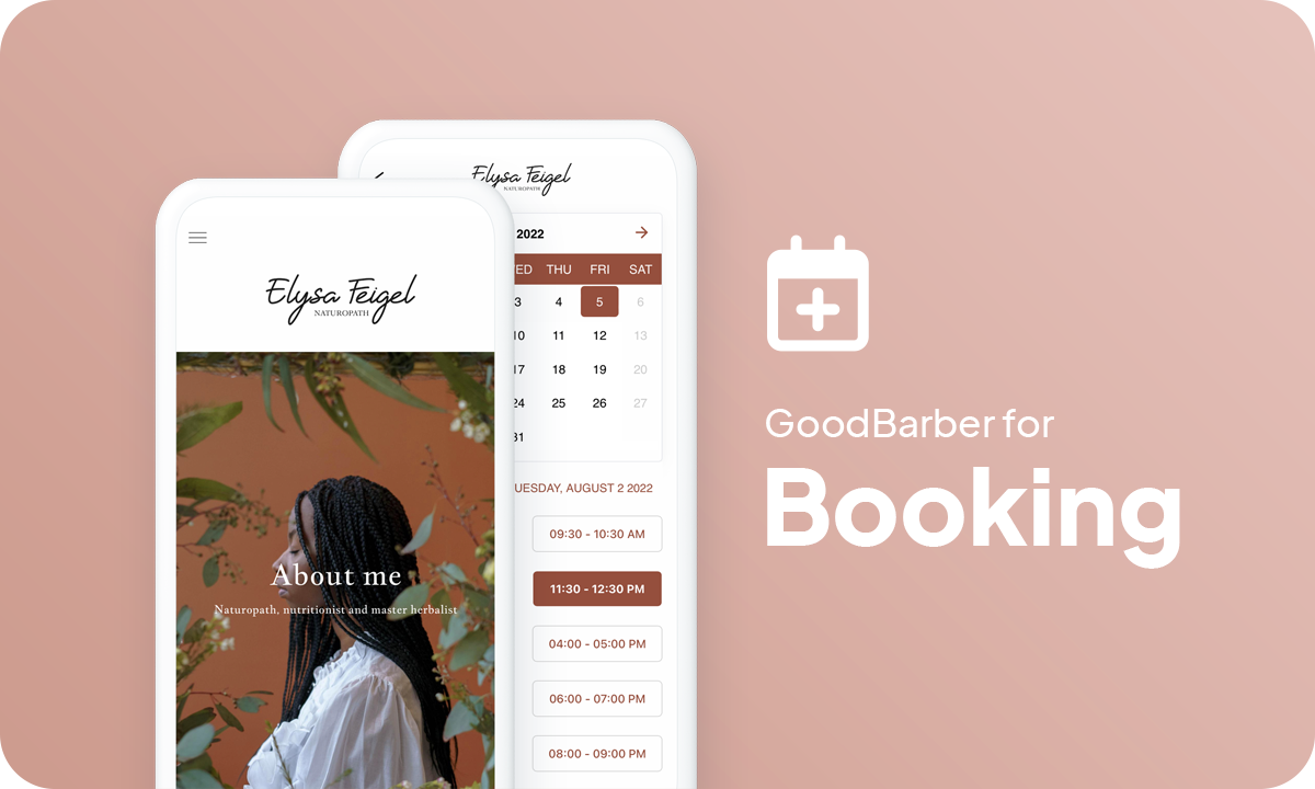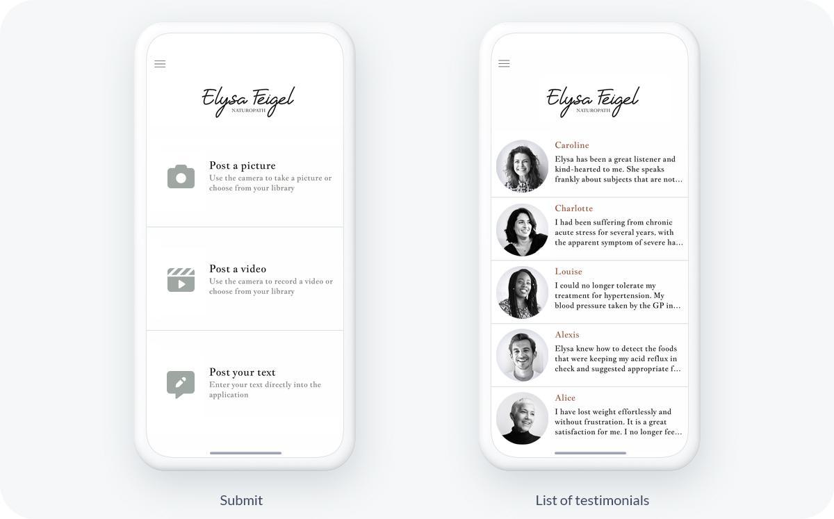 Laten we, om u een voorbeeld te geven, de app Elysa Feigel eens nader bekijken. Dit is de app van een natuurgeneeskundige die online Afspraken maakt. Het doel was om een serene, rustgevende, natuurgerichte Afbeelding te creëren. Dus kozen we voor natuurlijke kleuren zoals saliegroen en terracotta.