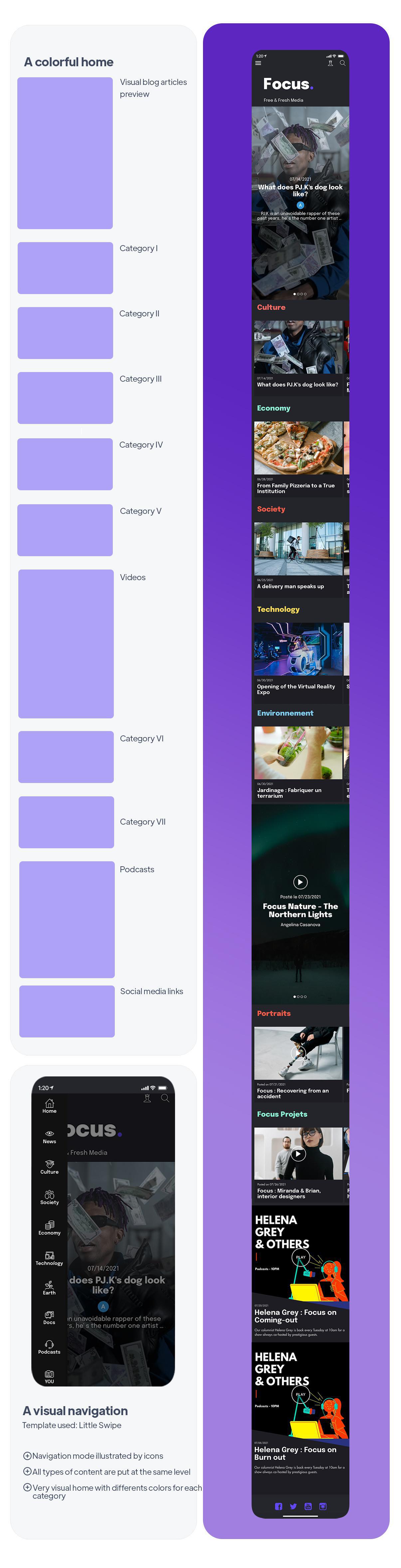 In het geval van de Focus-app is het de bedoeling om de aandacht te trekken van een jong publiek dat gewend is aan nieuwsfeeds op sociale netwerken. De informatie wordt duidelijk en beknopt gepresenteerd. Het Ontwerp van Mijn App moest opvallend zijn, en het moest gemakkelijk zijn om de weg te vinden.