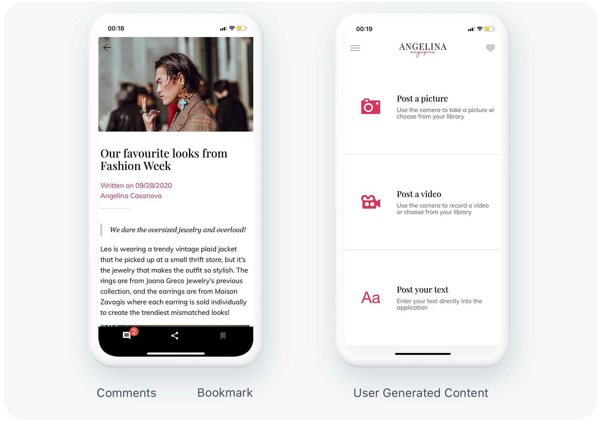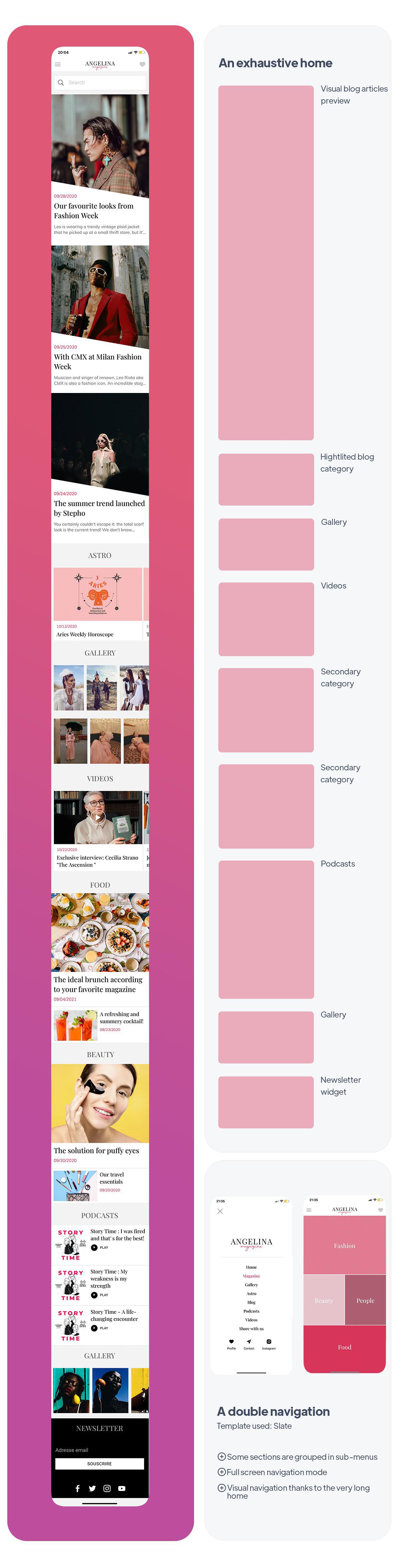 De app Angelina is een goed voorbeeld van een meer gespecialiseerde pers-app. De app gaat over mode en is gericht op liefhebbers die vaak al experts of professionals op hun gebied zijn. Omdat mode gerelateerd kan zijn aan kunst, was het essentieel om een app te bieden met een strak ontwerp en een Startpagina die duidelijk herkenbaar was met de kleuren van het tijdschrift.