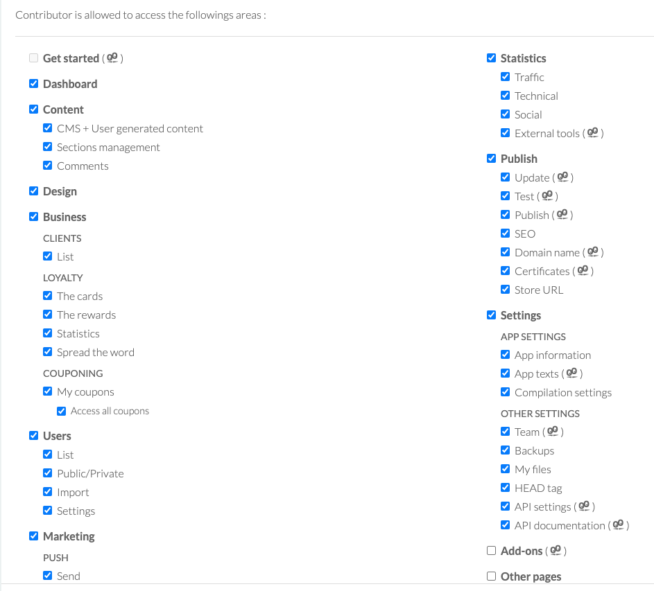 Er is geen limiet aan het aantal mensen dat u toegang kunt geven, dus als uw Klanten hun team erbij willen betrekken, kan iedereen meedoen. De toegangsrechten kunnen voor elke gebruiker aangepast worden: het grafische gedeelte kan gereserveerd worden voor een gebruiker uit het Ontwerp team, terwijl het Marketing team alleen toegang heeft tot Push Meldingen of Statistieken, enzovoort. Dit kan eenvoudig worden geconfigureerd in het dossier van elke gebruiker met behulp van aankruisvakjes.