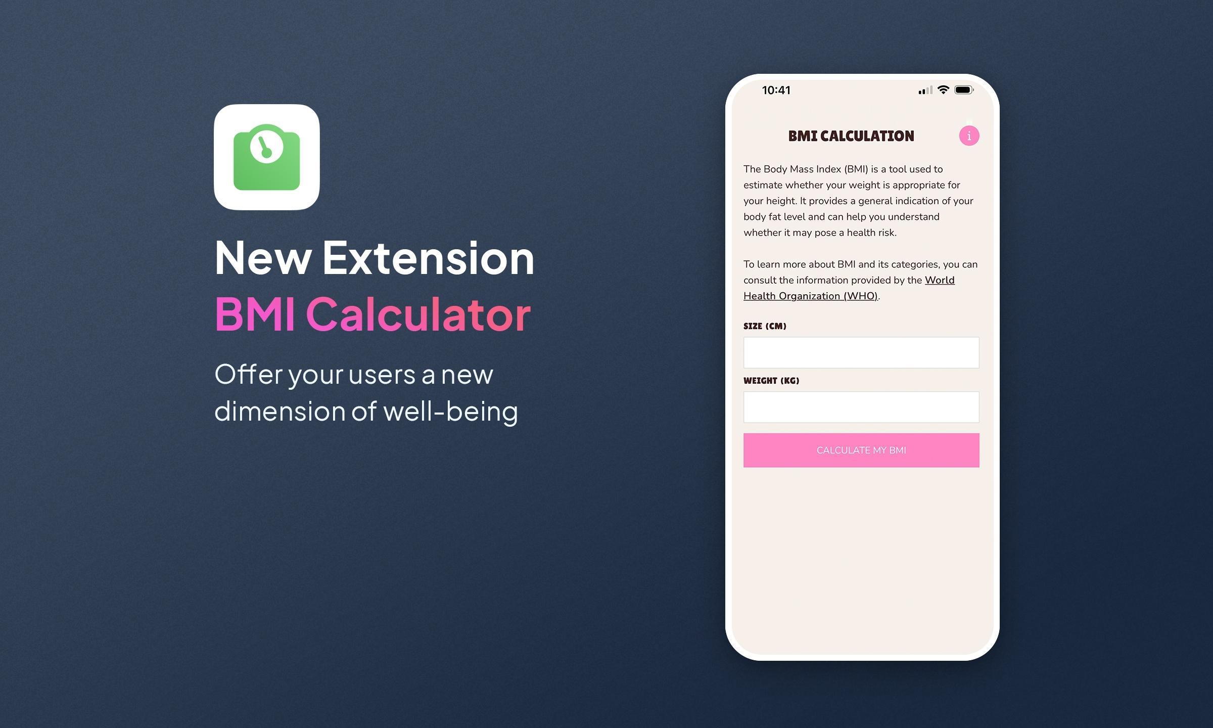 Met deze eenvoudige, intuïtieve en direct integreerbare functie kunnen uw gebruikers in slechts enkele seconden hun Body Mass Index berekenen.