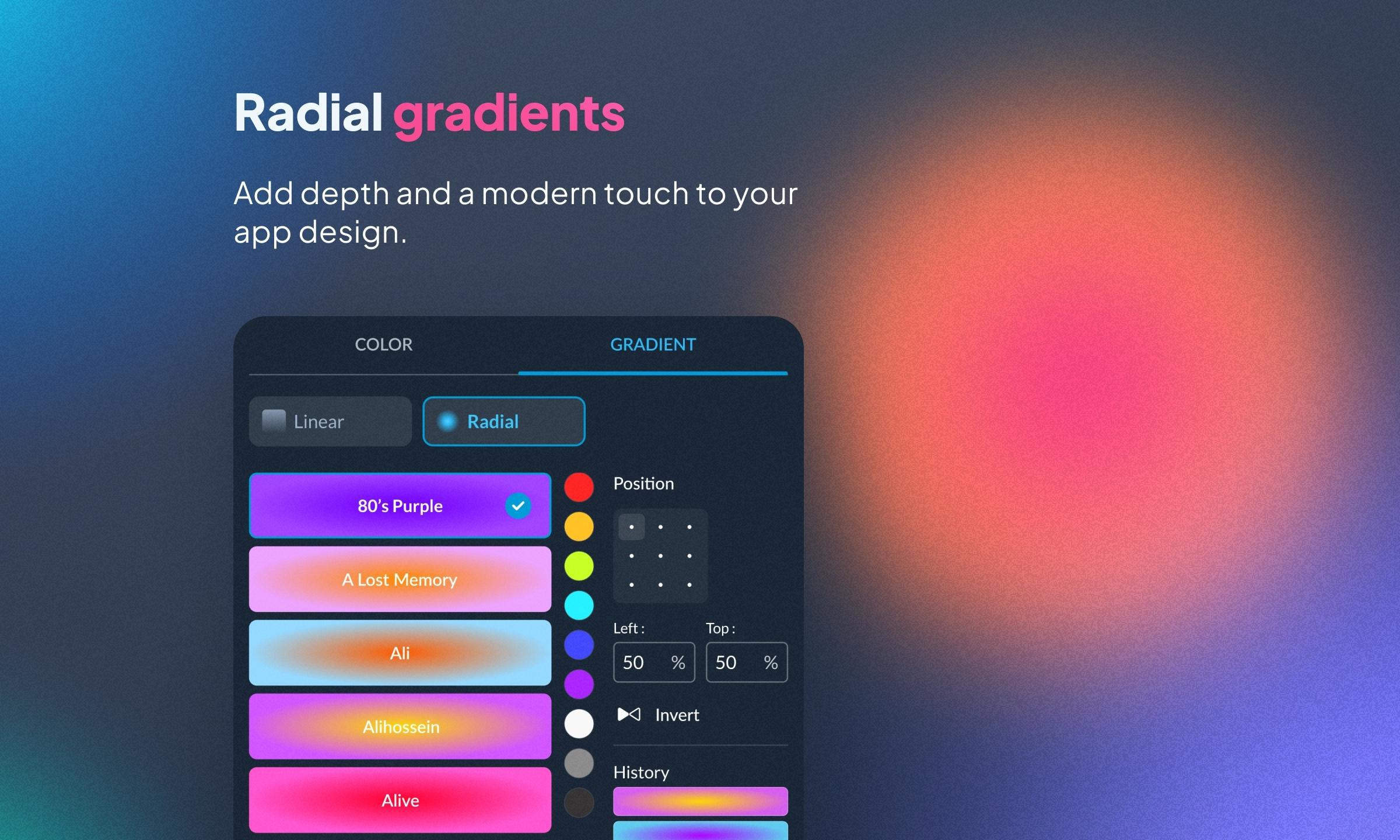 Het platform was voorheen beperkt tot lineaire kleurverlopen, maar ondersteunt nu ook radiale kleurverlopen , waardoor u een nieuwe laag creatieve flexibiliteit krijgt. Deze subtiele visuele effecten, zorgvuldig geplaatst, voegen diepte toe en kunnen de sfeer van een sectie volledig veranderen.