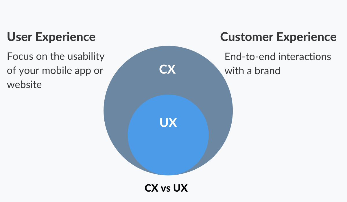 Klantenervaring (CX) en gebruikerservaring (UX) worden vaak door elkaar gebruikt. Strikt genomen gaat klantervaring over de interacties van een klant met een merk op een globaal niveau, terwijl UX meer specifiek over de bruikbaarheid van een applicatie, website of Producten gaat.
