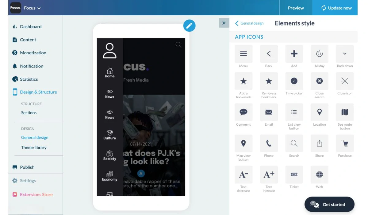Blader in het menu Algemeen ontwerp > Stijl van de elementen omlaag naar de app-iconen