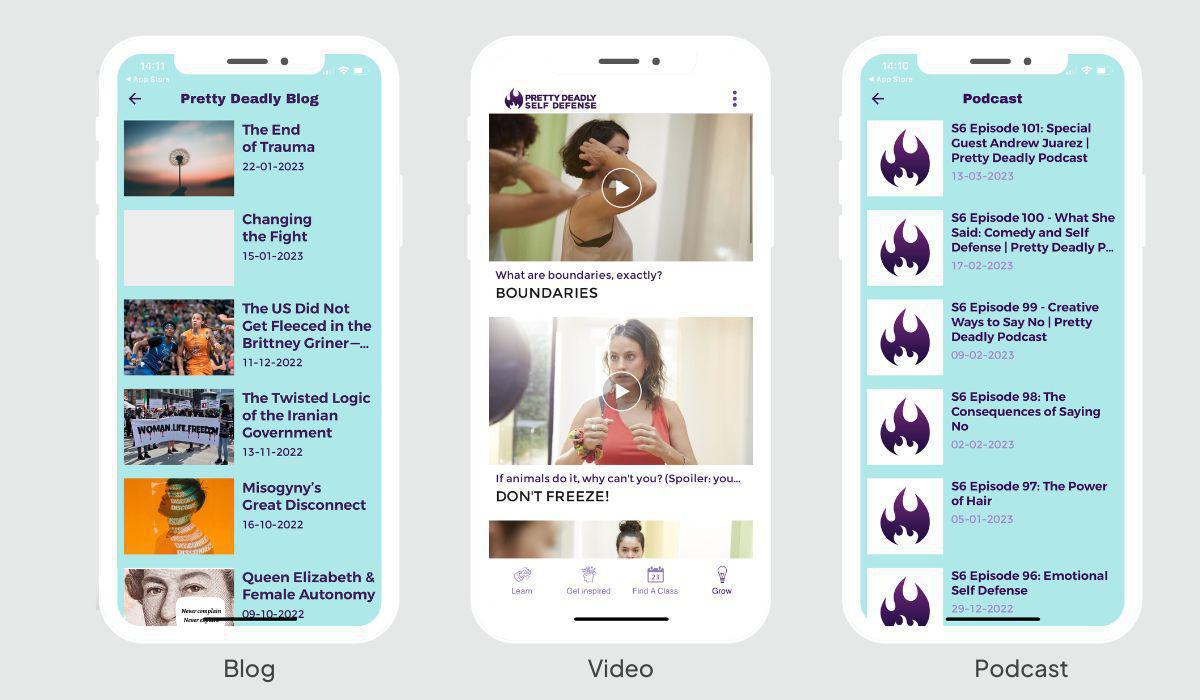 Maar omdat Berlijn zo'n internationale stad is, komen en gaan er voortdurend mensen - ook hun afgestudeerden! Ze kregen dus steeds meer aanvragen voor Pretty Deadly in andere landen - in feite veel meer aanvragen dan ze trainers hadden om de cursus te geven. Dus kwamen ze op het idee om een minicursus in een app te integreren, zodat mensen die ze (nog!) niet persoonlijk konden bereiken, toch toegang tot de bewegingen konden krijgen.