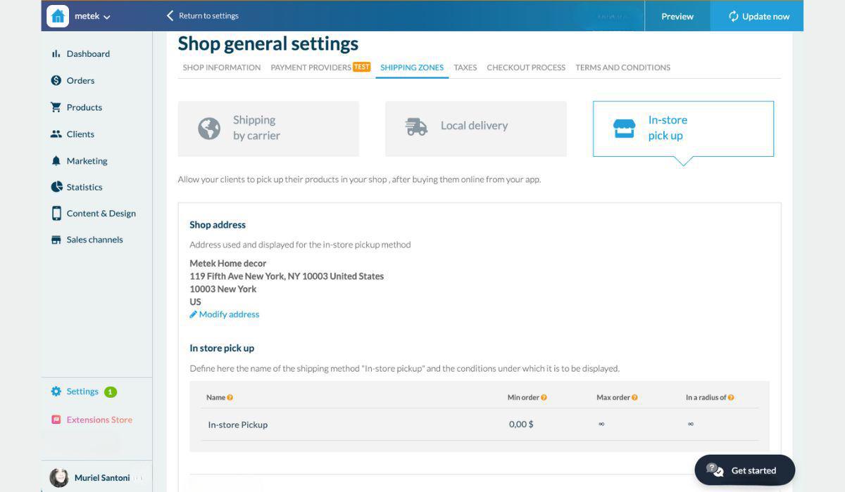 Instellingen voor Ophalen in de winkel worden gedefinieerd in het menu Instellingen > Winkel > Levering > Ophalen in de winkel.