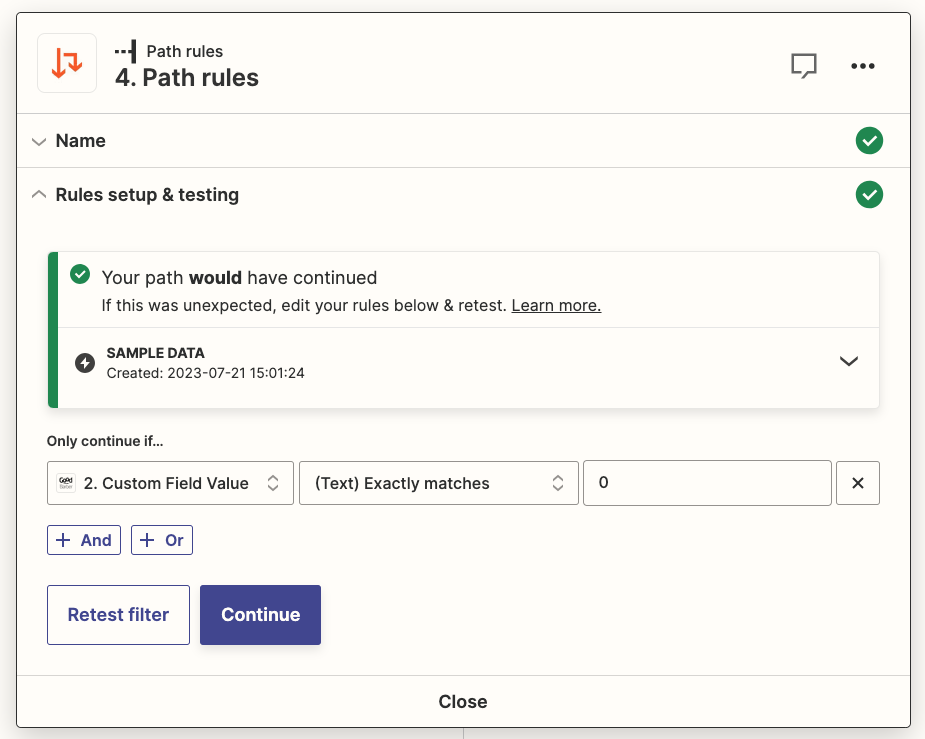 "Alleen doorgaan als Custom Field Value precies overeenkomt met 0"