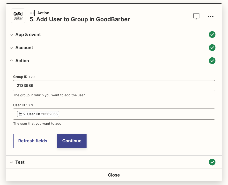 Vervolgens voeg ik een actie"Gebruiker toevoegen aan groep in GoodBarber" toe. Om deze actie in te stellen, voer ik de volgende informatie in: