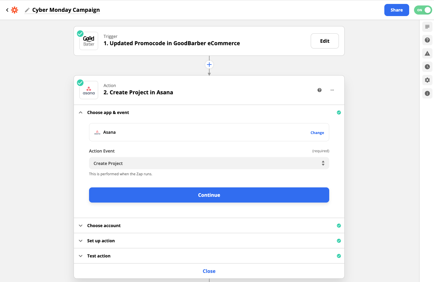 Ze gebruiken Asana voor werkbeheer, en telkens wanneer een promotiecode wordt geüpdatet, maakt de zap een project aan op hun dashboard. In dit project hebben ze precies aangegeven op welke KPI's ze moeten letten en welke acties ze vervolgens moeten ondernemen.