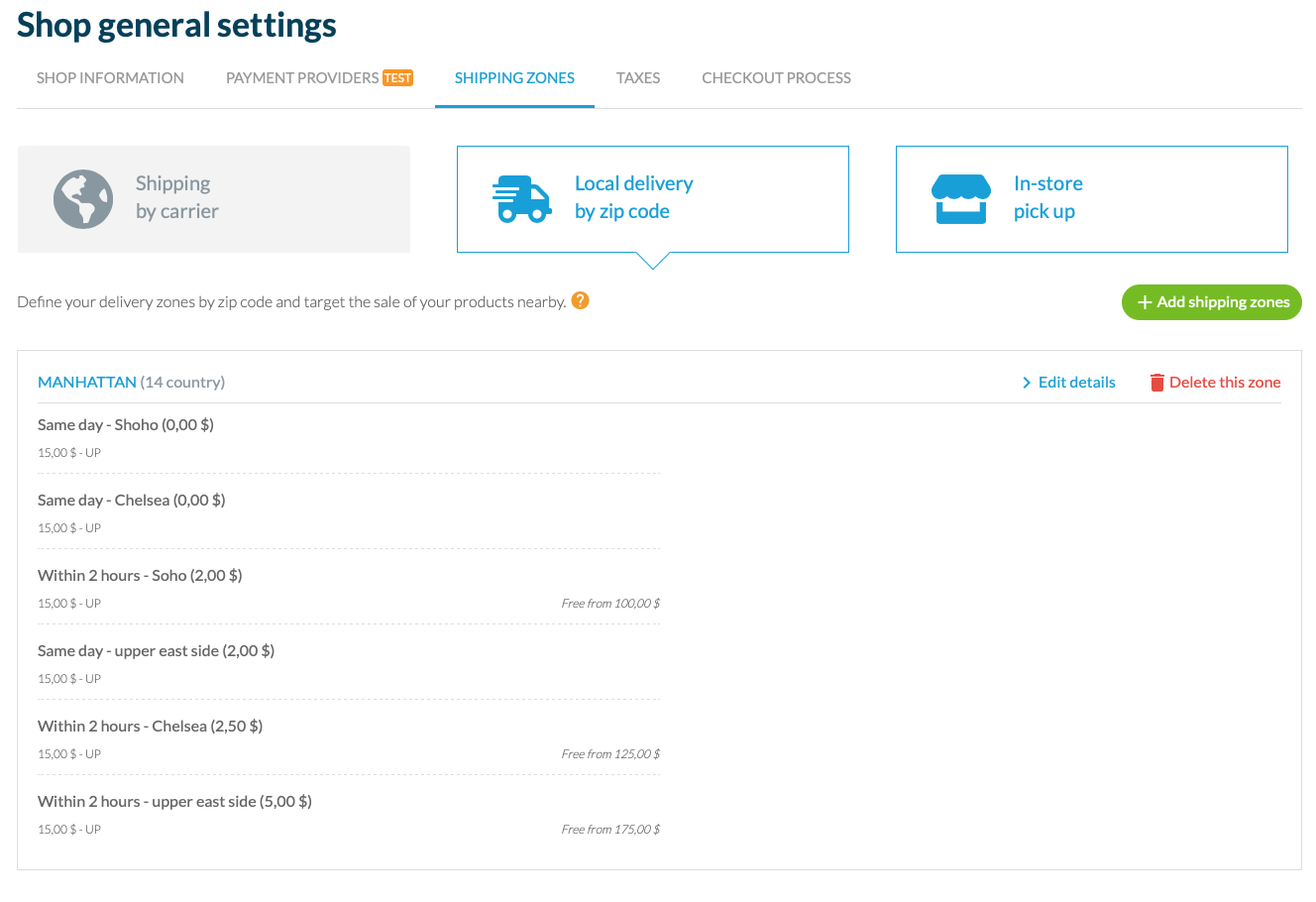 - Thuisbezorging per postcode : Configureer alle postcodes die u bestrijkt en bied uw klanten de optie van een snelle bezorgservice.