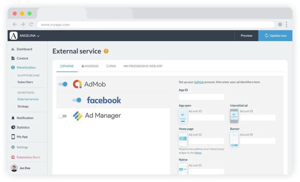AdMob van Google is een van de populairste en effectiefste platforms voor Monetarisatie voor mobiele applicaties. Het platform gebruikt geavanceerde algoritmen om de meest relevante advertenties aan uw gebruikers weer te geven, waardoor het doorklikpercentage verbetert en uw inkomsten stijgen. Met Admob kunt u advertenties van het Meta Audience Network (voorheen Facebook) in uw applicatie integreren, zodat nieuwe adverteerders hun advertenties kunnen weergeven. U hoeft zich nergens zorgen over te maken, Admob zorgt voor de complexere aspecten van het beheren van uw advertenties.