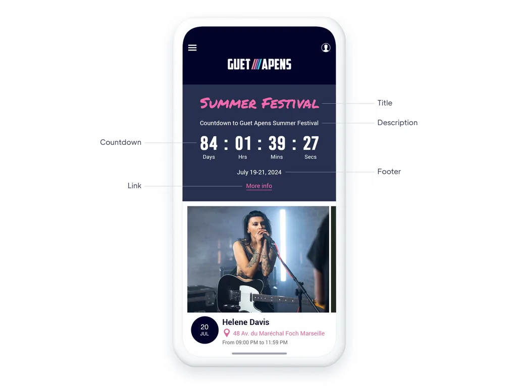 In een wereld waar tijd een kostbaar goed is, telt elke seconde, vooral voor degenen die de aandacht van hun publiek willen trekken en een gevoel van urgentie rond hun Agenda of promoties willen creëren. Met dit in gedachten presenteert GoodBarber met groot genoegen zijn nieuwste innovatie: de uitbreiding Countdown. Een eenvoudige en elegante oplossing voor het integreren van een aftelklok in de Startpagina van uw applicatie.
