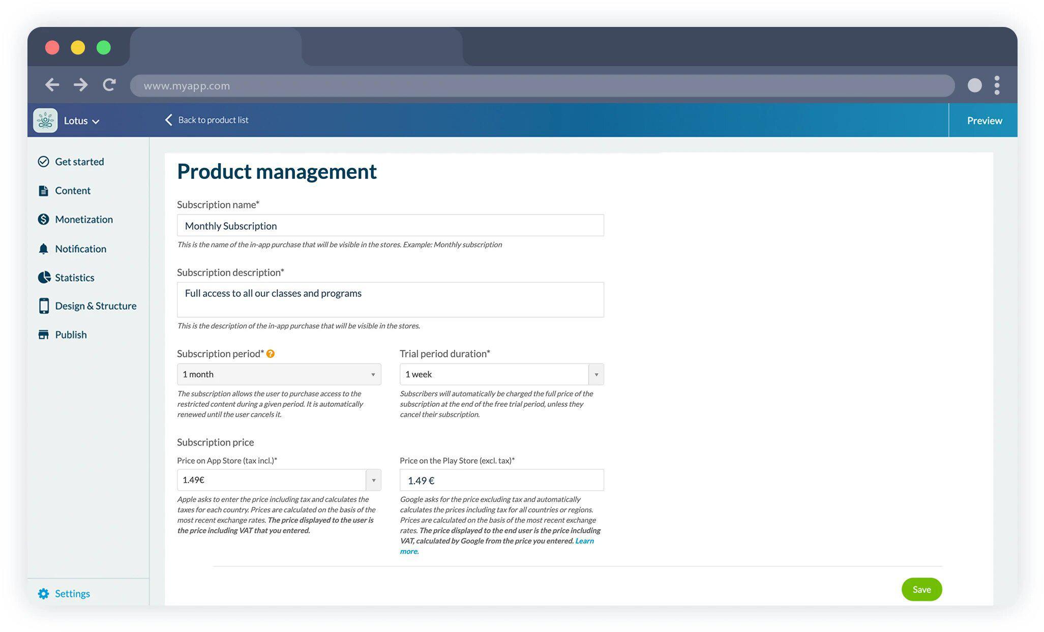 Er zijn veel voordelen verbonden aan het aanbieden van een Lidmaatschap in uw applicatie. Bijvoorbeeld het feit dat er geen creditcardkosten in rekening worden gebracht, maar bovenal dat voor uw gebruikers de geïntegreerde Kopen een uitstekende ervaring en toegevoegde waarde biedt zonder dat ze de app hoeven te verlaten: ze hoeven geen kaartgegevens in te voeren, alles is gekoppeld aan hun iOS- of Android-accounts.