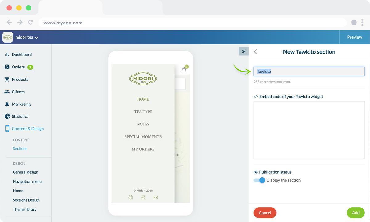 Deze twee acties zullen de Instellingen voor Secties openen. Geef uw sectie een naam en kopieer en plak de integratiecode van de Tawk.to widget.