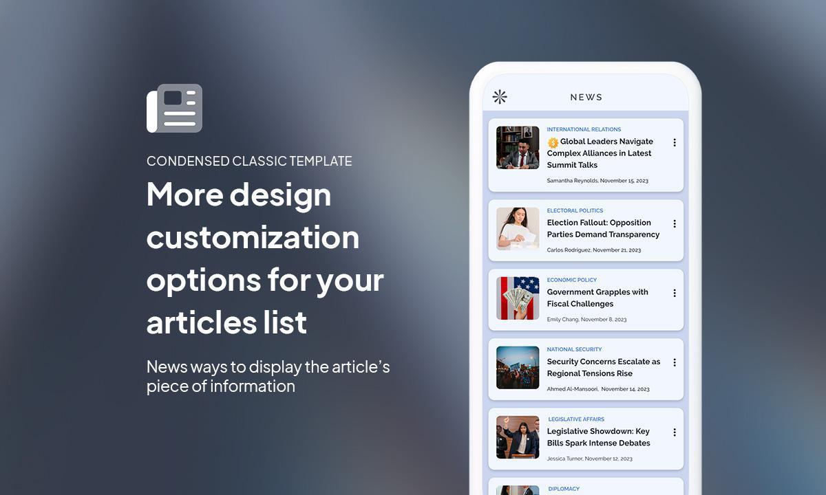 Aanpassing staat centraal in de sjabloon Condensed Classic. Het is volledig aanpasbaar en u hebt de vrijheid om te spelen met kleuren, Lettertypen, afbeeldingsformaten, de positionering van elementen en nog veel meer, om het aan te passen aan de unieke visuele identiteit van uw toepassing. Dankzij deze flexibiliteit kunt u een onderscheidende en onvergetelijke gebruikerservaring creëren.