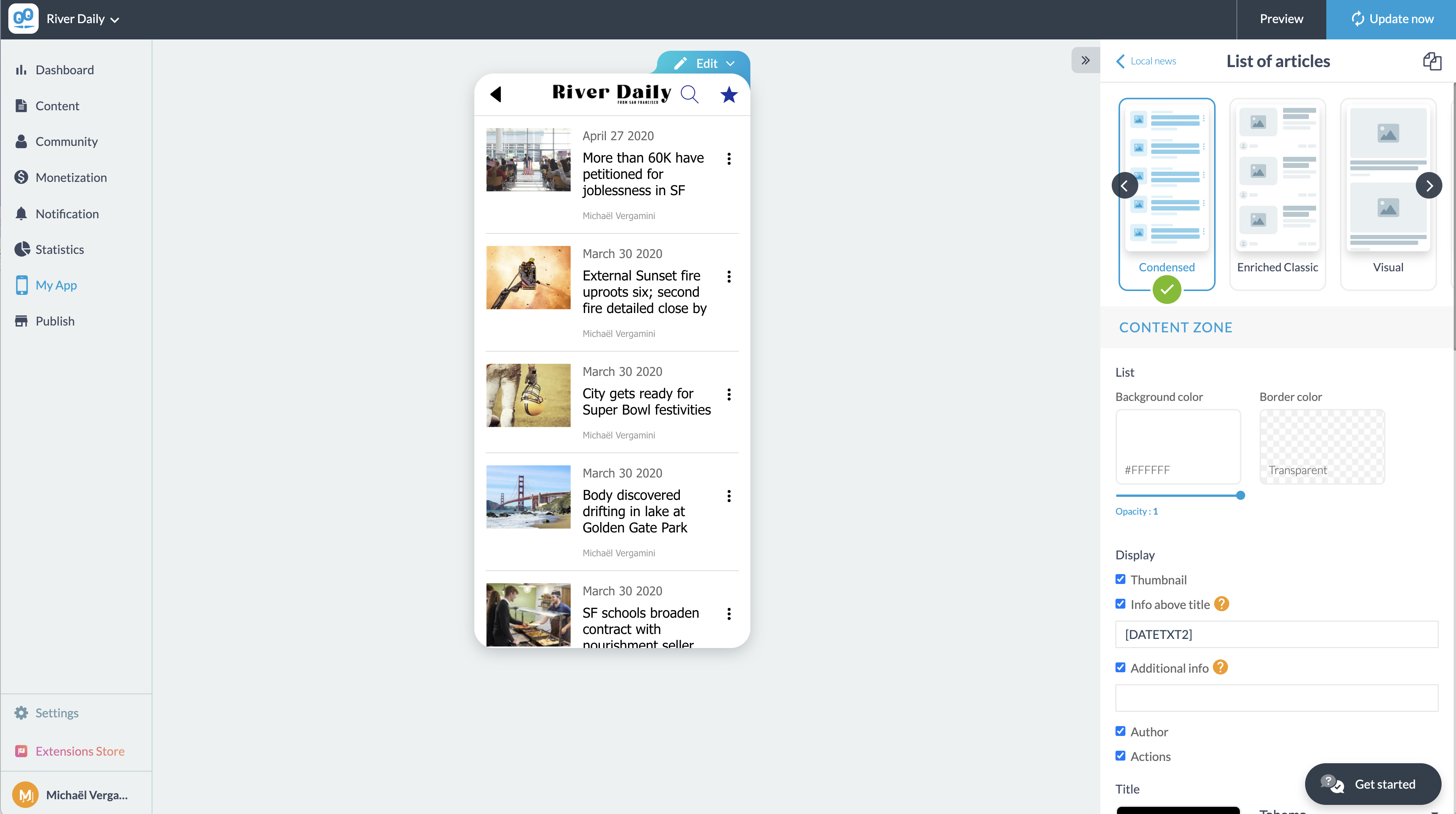 Ga in uw backoffice naar het menu Mijn App > Structuur. Kies vervolgens de sectie Blog waarop u de sjabloon Condensed Classic wilt toepassen, of maak een nieuwe aan. Kies vervolgens de Lijst. Nu hoeft u alleen nog maar het sjabloon Condensed Classic te selecteren en de parameters ervan in te stellen.