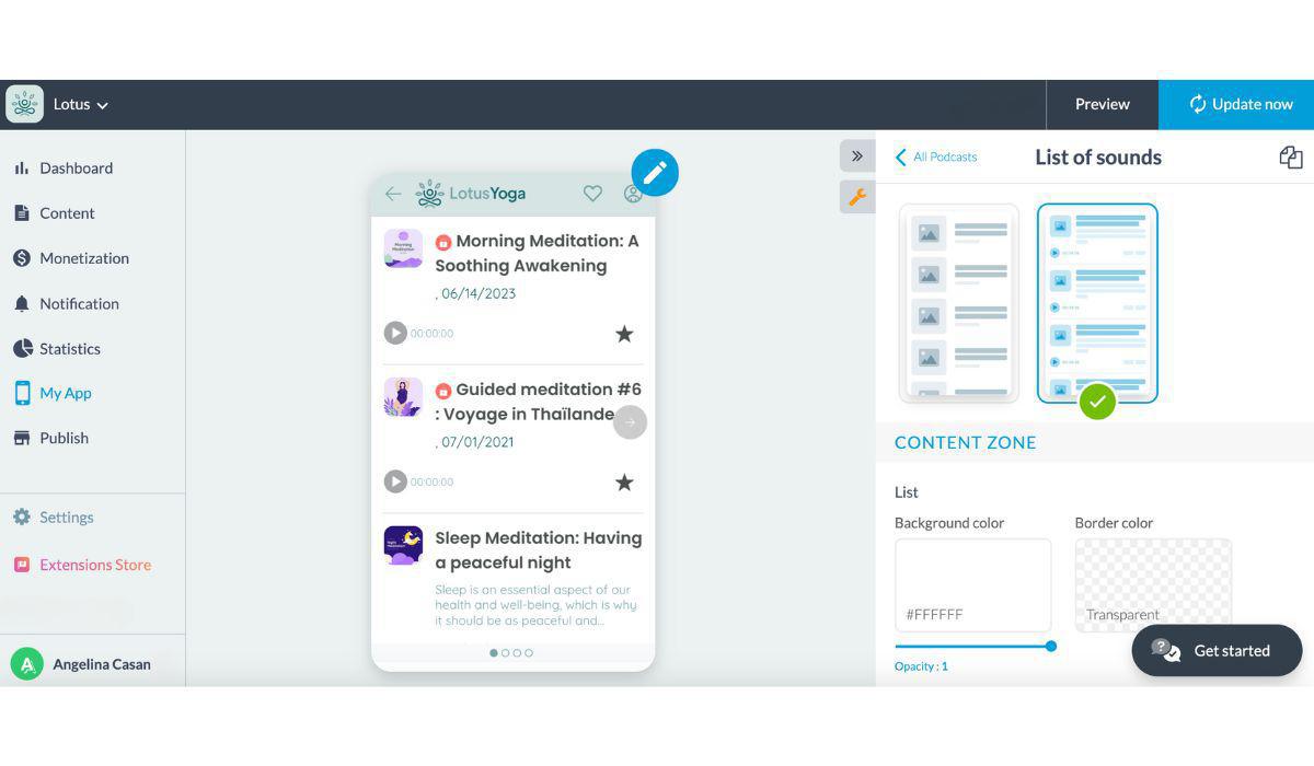 Ga in uw backoffice naar het menu Mijn App > Structuur > klik op uw podcastsectie > EDITIE geluid Lijst bewerken. Selecteer de 2e sjabloon (met de afspeelknoppen).